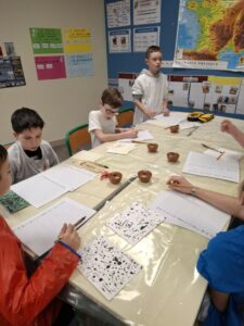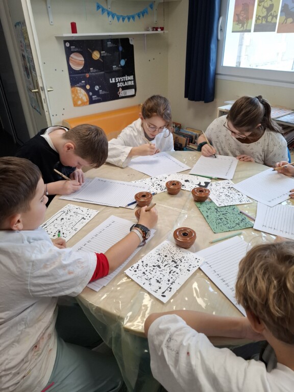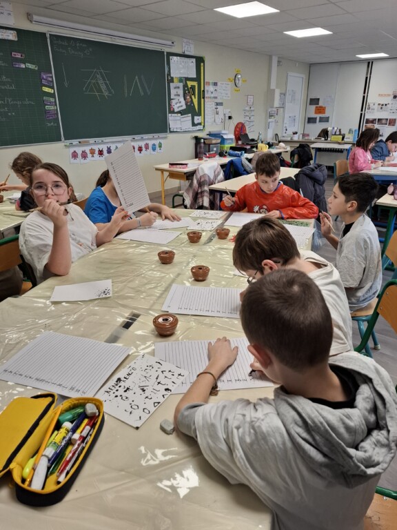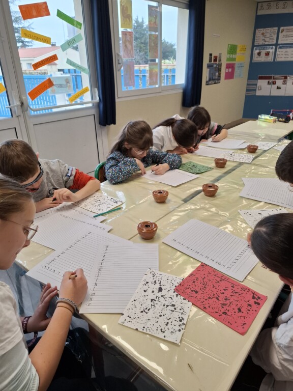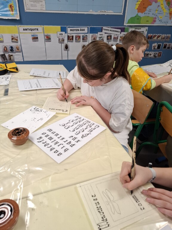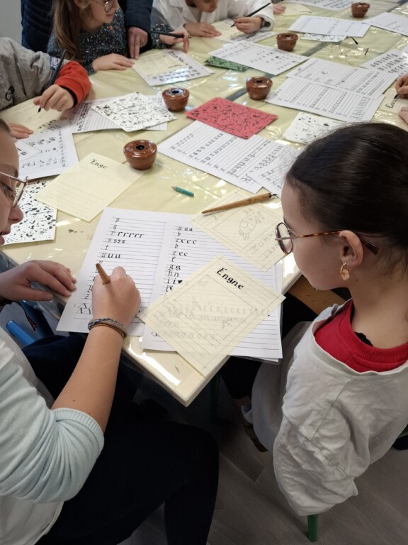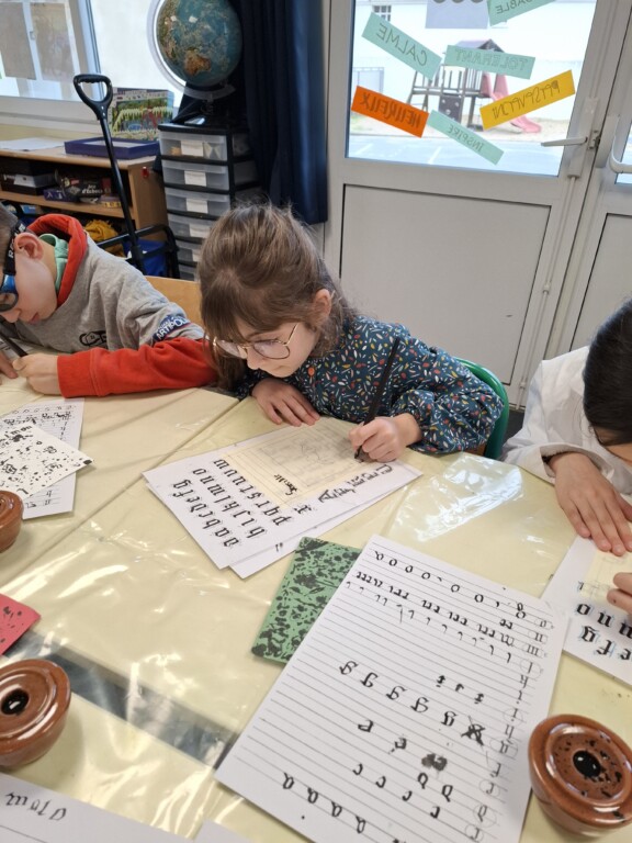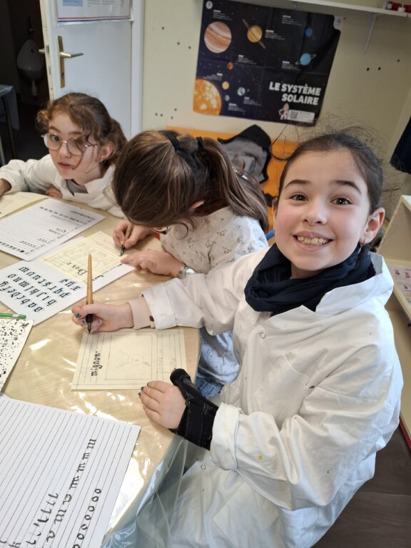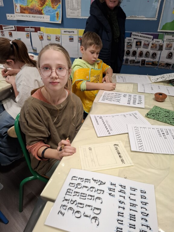 Pour cette séance, nous avons découvert les techniques d’écriture à la plume et à l’encre. Il a également fallu apprendre à tracer les lettres comme au Moyen-Age, dans le style gothique. Une belle découverte pour les enfants !